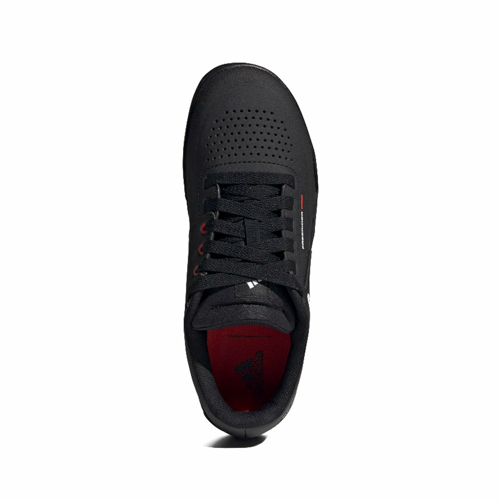 The Adidas Five Ten Freerider Pro Flat Pedal Shoes-Core Black/FTWR White/FTWR White couples a reinforced toebox to a quick to dry, water resistant, synthetic upper. The Stealth S1 Dotty rubber compound in the sole provides the grip you need to stay firmly planted on your pedals.