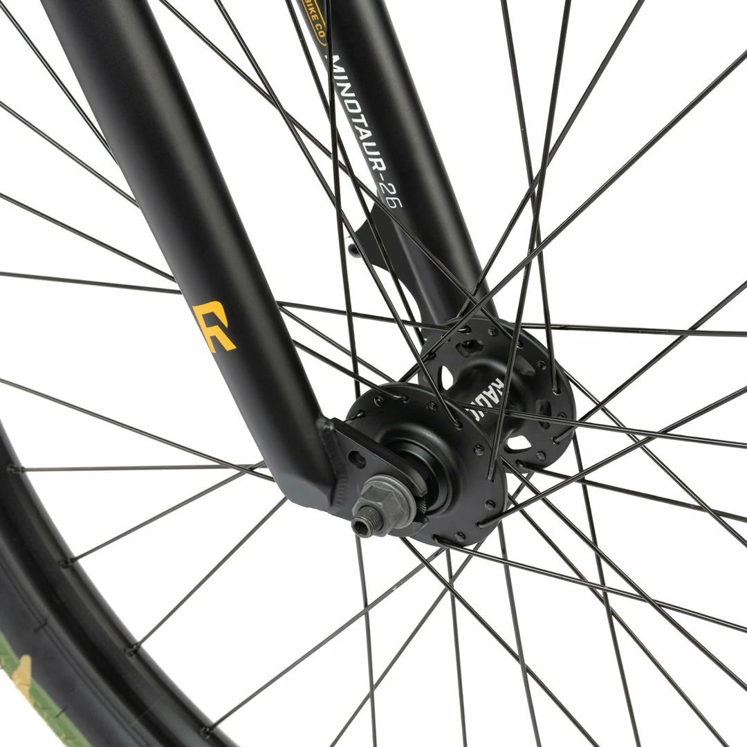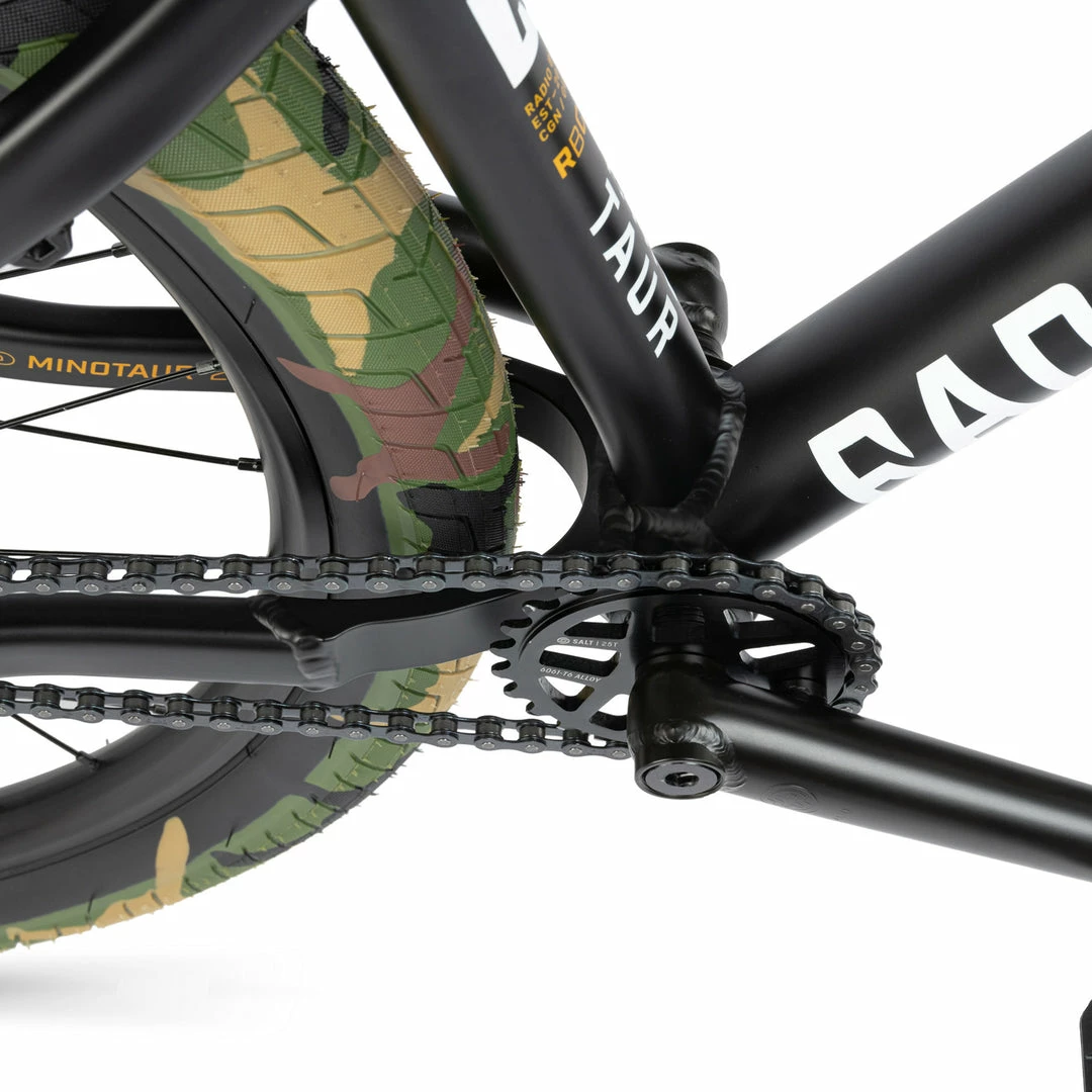 The Radio 2021 Minotaur 26 BMX Dirt Jump Bike-Matte Black is a high performing dirt jump/pump track bike that will allow to reach your potential without completely decimating your wallet. Featuring a chromoly frame and ridged chromoly fork for strength and responsiveness. High quality SaltPlus three piece cranks and a Tektro disc brake round it all out.