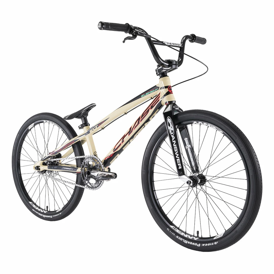 Building a custom Pro level race bike can be a difficult task while trying to stay within a budget. With the Chase 2021 Element Cruiser 24″ BMX Race Bike-Sand, we did all the hard work for you. We wanted to offer a bike that our Chase Factory Pro riders could race right out of the box, while taking into consideration that the cost needs to be realistic for everyday racers who still want the best bike. With the new 2021 Chase Element, we have done just that, offering you the best bike for the price! The 2021 Element utilizes the same geometry as our Championship winning ACT and RSP race frames. The Element frame features Hydroformed and butted tubing, a new integrated chain tensioner / disc brake mounting system, a Press Fit Bottom Bracket, and a 31.8 Handle Bar/Stem combo.