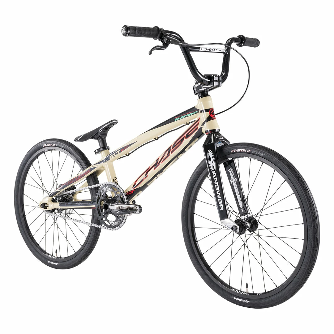 Building a custom Pro level race bike can be a difficult task while trying to stay within a budget. With the Chase 2021 Element Expert BMX Race Bike-Sand, we did all the hard work for you. We wanted to offer a bike that our Chase Factory Pro riders could race right out of the box, while taking into consideration that the cost needs to be realistic for everyday racers who still want the best bike. With the new 2021 Chase Element, we have done just that, offering you the best bike for the price! The 2021 Element utilizes the same geometry as our Championship winning ACT and RSP race frames. The Element frame features Hydroformed and butted tubing, a new integrated chain tensioner / disc brake mounting system, a Press Fit Bottom Bracket, and a 31.8 Handle Bar/Stem combo.