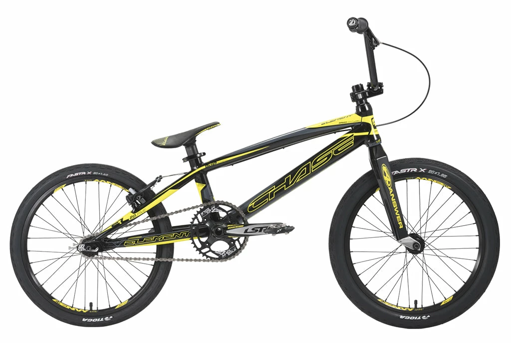 While function is more important that fashion, the first thing you will notice about the 2019 Chase Element bike is the new Flow Graphics on the Brilliant Black Element frame that features our exclusive Aero Pivotal seat post and Aero clamping system, Hydroformed Premium Speedlite Alloy, with the Chase BIO-FIT geometry. Custom Graphics also grace the Answer Dagger Carbon Fork and the Sun Ringlé Envy rims. The Matching Elevn PC seat, the Excess LSP Cranks, and The Chase Bars with Flow Graphics makes the bike look as factory as Joris and Connor too! Next we made the bike literally faster, by adding the Tioga FASTR X tires to the Element complete. We didn’t stop there on the wheels either, as we upgraded the Rear hub with our new Triple Precise Clutch System, that has less drag while offering fast engagements and 72 points of Engagement. Other standout features include a Shimano Brakes, Insight C.O.G.S. grips, 4 Bolt Chainring Chain tensioners, and a KMC Chain.