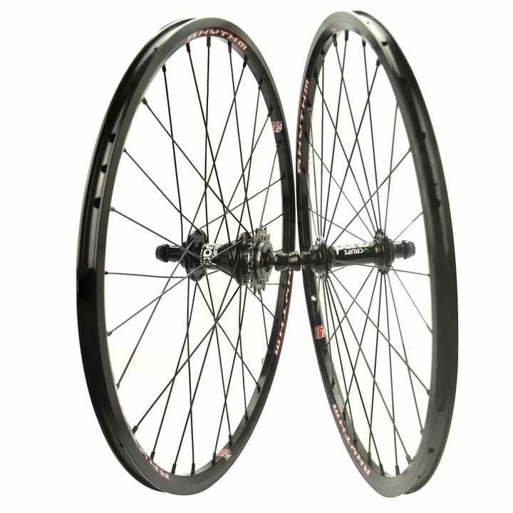 Crupi’s New Pro36 Cruiser race wheels feature our new Quad 36H hubs made from 6061-T6 aluminum with 10mm chromoly axles for increased strength and stiffness, precision sealed bearings throughout and a Shimano compatible chromoly driver. Laced with 14G spokes and alloy nipples to 36H Rhythm Section 24 x 1.75 rims, extruded from 6061-T6 aluminum for strength and durability. Includes 16T aluminum cog.