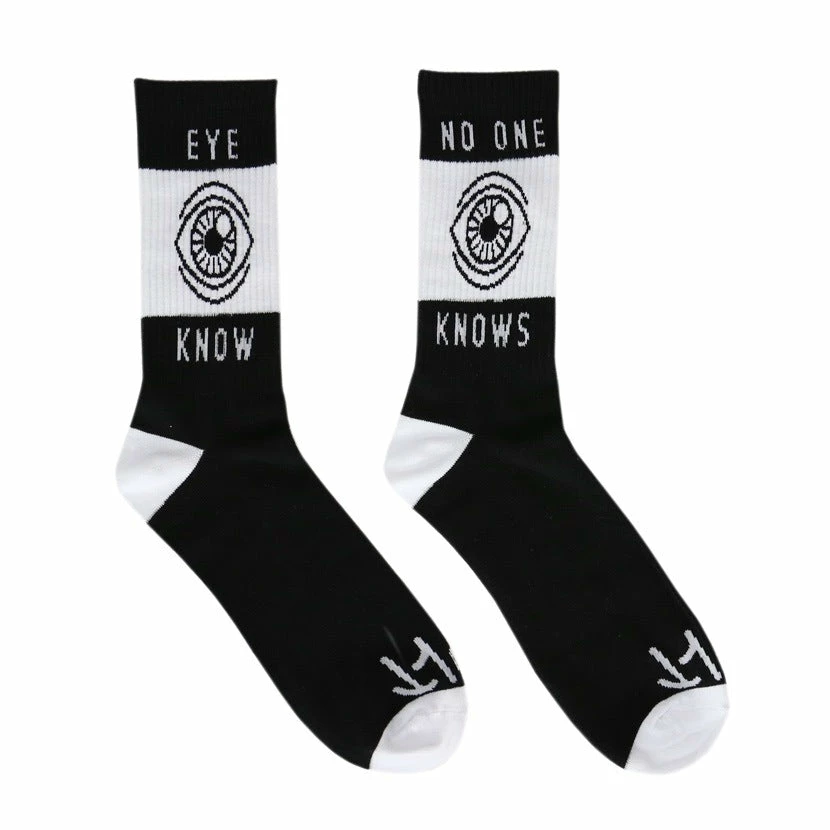 “EYE KNOW” on one sock… “NO ONE KNOWS” on the other sock…
