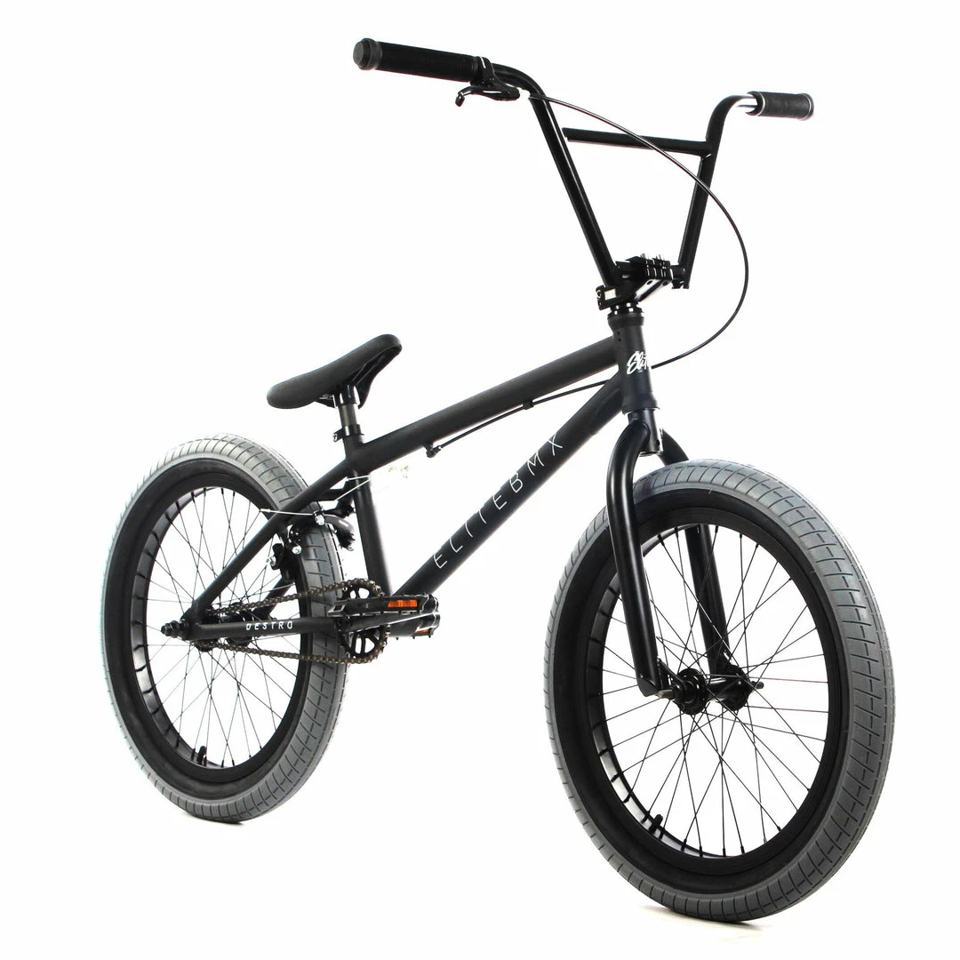 The Elite BMX Destro 20.5″TT BMX Freestyle Bike-Black Grey is a mid-level bike at an entry-level price. Featuring upgraded components from Elite’s entry-level bike, the Destro has Tektro Alloy brake lever and U-brake, a 25/9 gear ratio for more clearance under the bike, a sealed bottom bracket, and sealed integrated headset. Comes with modern sized 20×2.4″ tires.