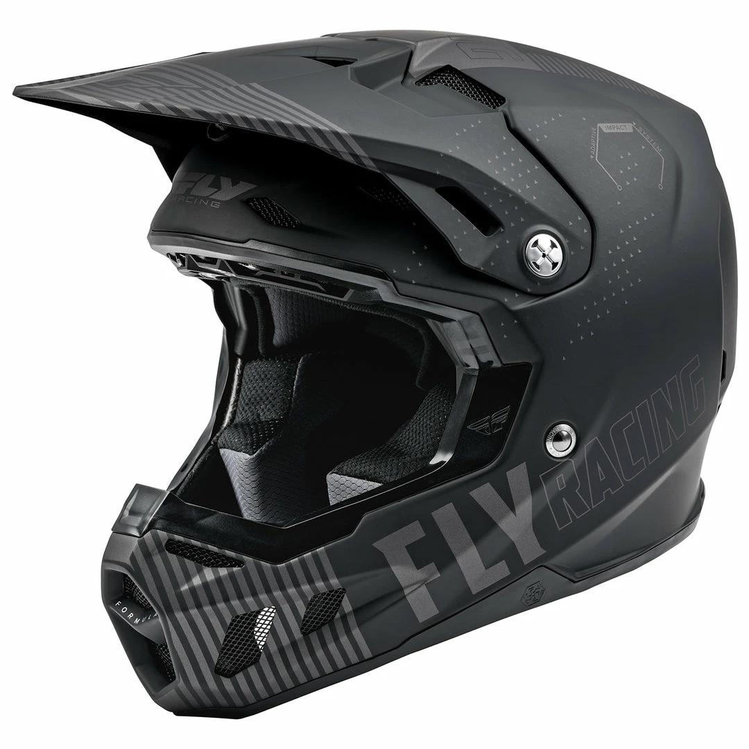 The Fly Racing Formula CC Primary BMX Race Helmet-Black/Grey Adaptive Impact System (AIS) whose high-performance ecosystem of structural designs and energy mitigating materials- including RHEON, a leading edge visco-elastic material- is fine tuned to greatly improve impact management over traditional helmets. Tested to exceed ECE and DOT standards, The Formula CC helmet redefines expectations in helmet technology and performance.