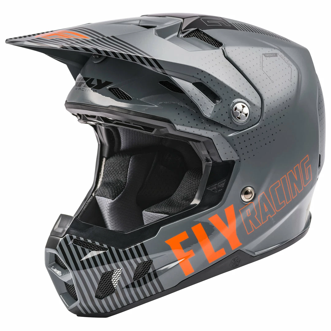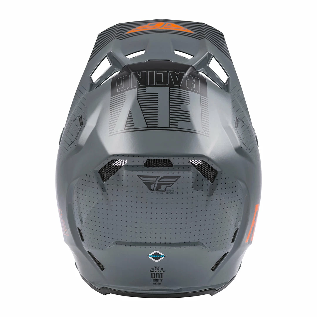 The Fly Racing Formula CC Primary BMX Race Helmet-Grey/Orange Adaptive Impact System (AIS) whose high-performance ecosystem of structural designs and energy mitigating materials- including RHEON, a leading edge visco-elastic material- is fine tuned to greatly improve impact management over traditional helmets. Tested to exceed ECE and DOT standards, The Formula CC helmet redefines expectations in helmet technology and performance.