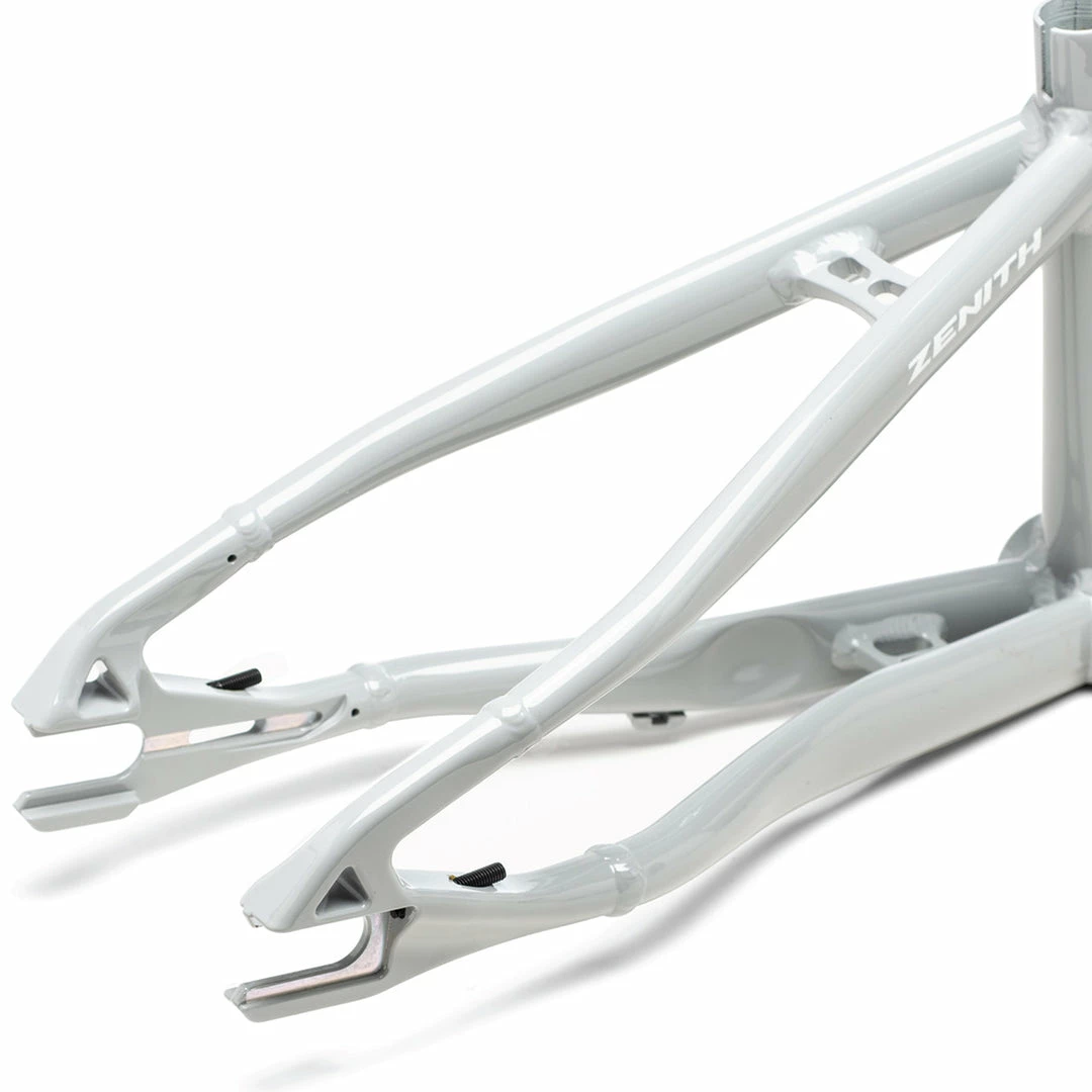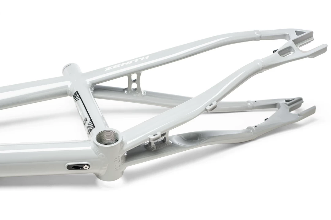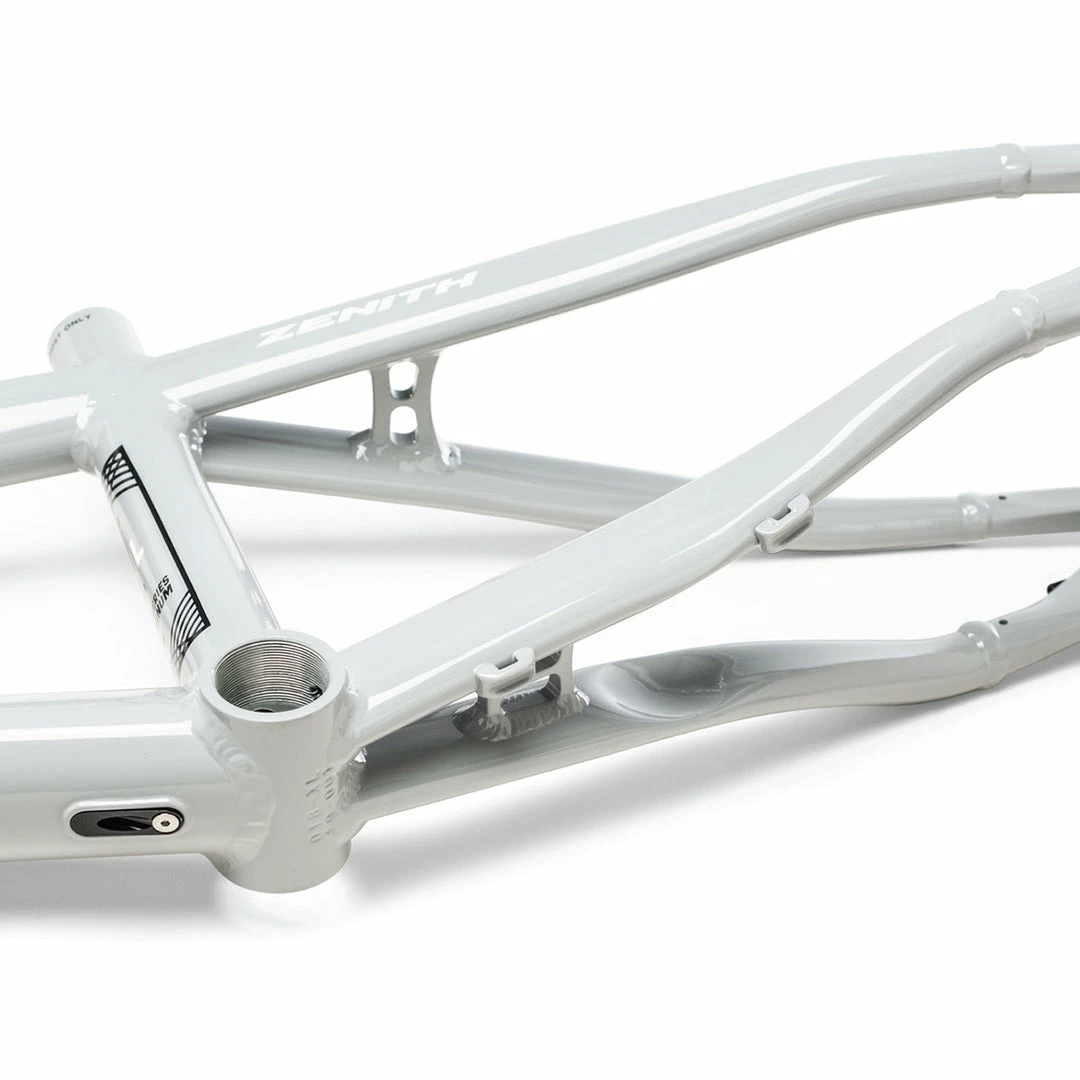 A horizontal sliding axle/flat-mount disc brake system provides 30mm of rear wheel adjustment. Integrated chain tensioners, 10mm dropouts, 20mm dropouts, and all axle hardware is included. The wide stance rear end features a trapezoidal seat mast for increased stiffness at the bottom bracket. CNC machined bridges, 3D dropouts, and internal cable routing give the Zenith a clean look. The Zenith utilizes a tapered 1-1/8”—1.5” head tube for durability. A DUO Brand H2 sealed integrated tapered headset is included, along with an extra lower bearing race to fit standard 1-1/8” forks.