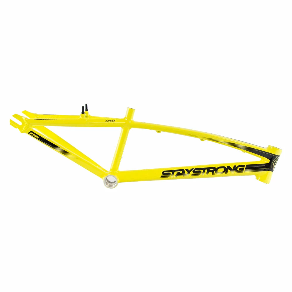 The 2019 V2 Stay Strong frame with an all new 100% re-design from our V1 model. Our Pro sized frames now feature a tapered 1.5 head tube, Press Fit bottom bracket (PF30), 20mm rear dropouts with 15mm and 10mm adaptors and chain tensioners included. The V2 also uses a 31.6mm seat post which reduced weight whilst helping improve stiffness. Overall the frame is coming in at a competitive weight and around a 25% weight saving on our original frames. The smooth welds also help give the all new water decals and logo a clean look. This low, triangular shaped frame has a modern look with overall balanced stiffness, combined with the weight saving this V2 frame can help you reach your racing goals in 2019.