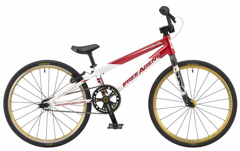 The Free Agent 2015 Team Junior BMX Race Bike-Red/White has everything you would expect from a top of the line complete BMX bike. Lightweight frame with custom formed tubing, carbon fork, outboard bottom bracket, aftermarket brakes and more make this BMX race machine destined for the podium.