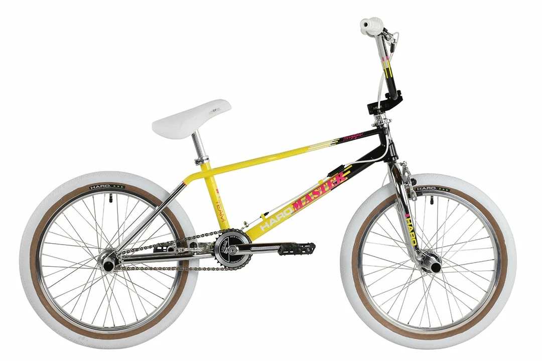 The Haro Lineage Team Master BMX Bike-Black/Yellow features classic styling with modern updates on craftsmanship and durability.