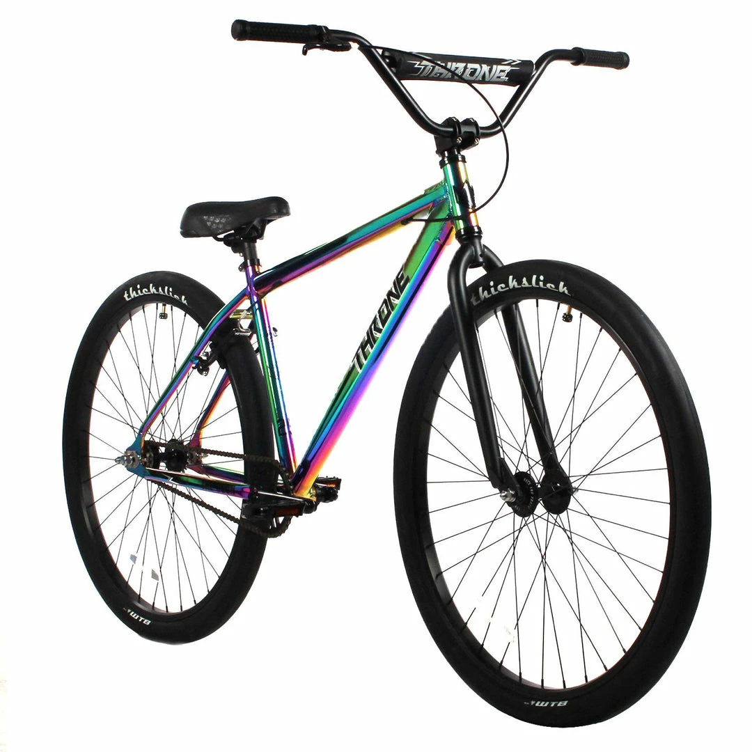 In collaboration with one of LA’s urban cyclists and underground MCs, we created an developed a seamless introduction into the 29″ urban street bike culture with BlocBoi Fame. Our new Throne Cycles The Goon 29″ BMX Freestyle Bike-Oil Slick fixed-gear urban bike is meant for the streets and overall shredding! It comes equipped with a 16T fixed cog and rear brake but with multiple ways to set it up you can run it brakeless, freewheel, dirt, wheelie shredder, it is a platform for pretty much anything you want to run the streets. With large tires and hard riding, it can handle trails, jumps, wheelies and that courier life in the city.