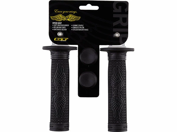 GT Wing design is embossed in soft kraton rubber for maximum comfort. Width: 140mm. Dual lock on clamps with closed cap.
