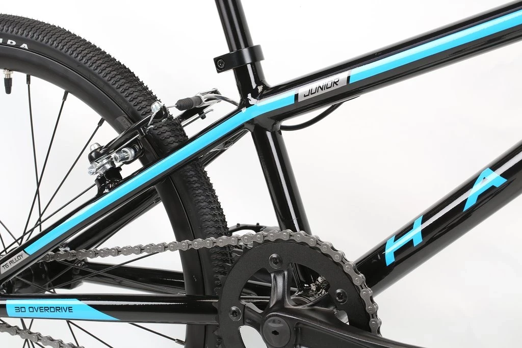 Rising further up the size scale is the Race Lite Junior. The Junior shares the same 20″ alloy wheel size as the Mini but the 6061 alloy frame, 3 piece alloy cranks and handlebars all increase in size to accommodate growing riders. Balanced geometry, function and control are all achieved through features like integrated chain adjusters, 100% chromoly fork, CNC alloy stem and sealed bearings throughout the wheels and bottom bracket.
