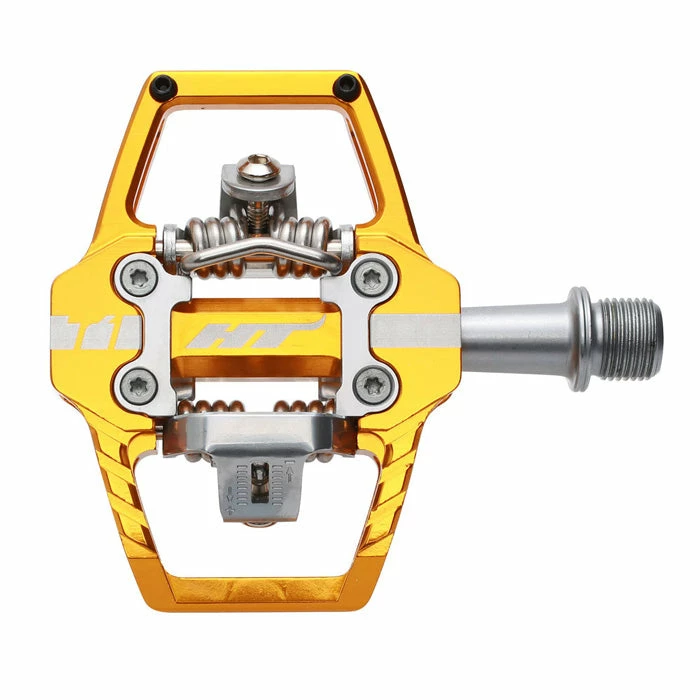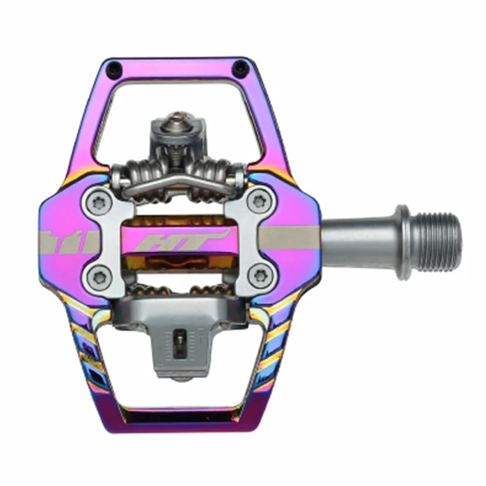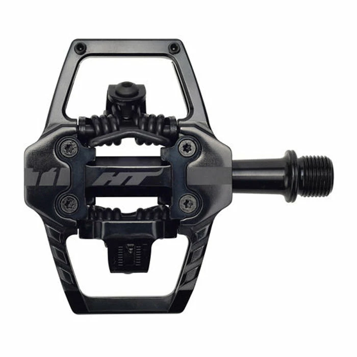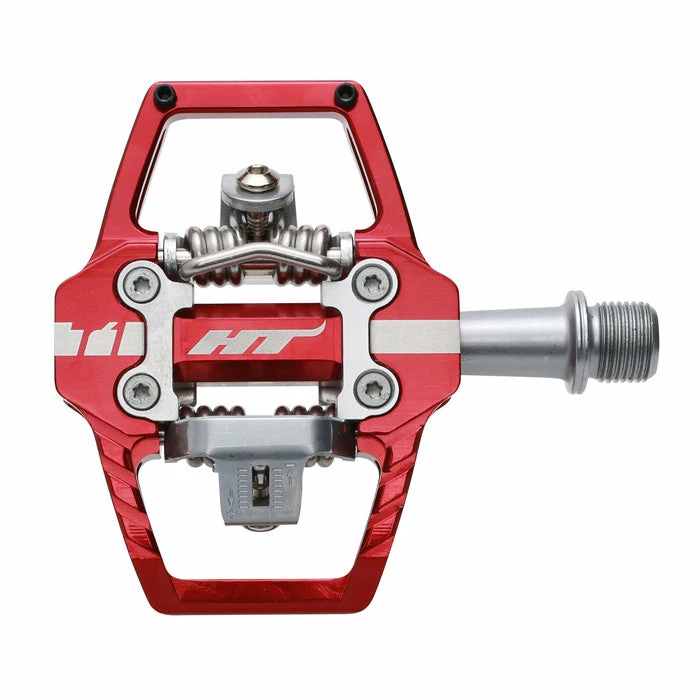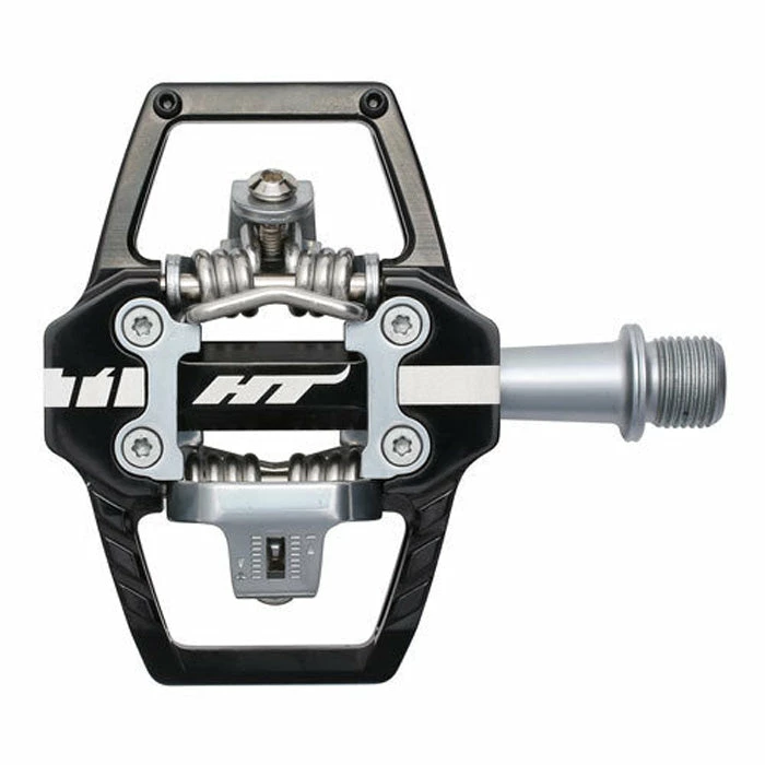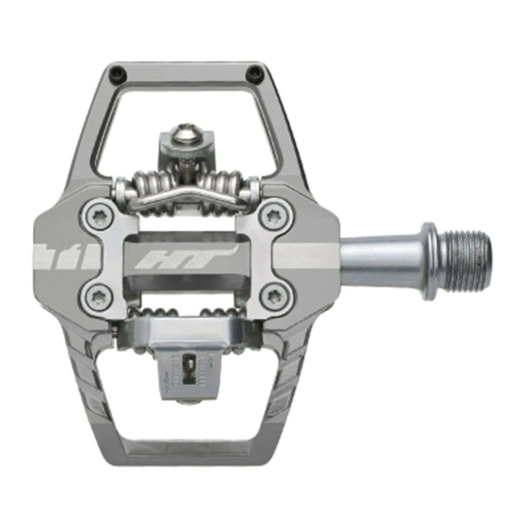 HT T1 Clipless BMX Pedals at J&R Bicycles are constructed from CNCd and extruded aluminum with a CNCd chromoly spindle for stellar durability and performance. Featuring HT’s proprietary cleat system you have your choice of either 4 or 8 degrees of float. When you are clipped into these pedals, you are CLIPPED in, but they’ll release in the blink of an eye when you want them to. They also feature two pins on each side to afford you some grip pre and post clip in.
