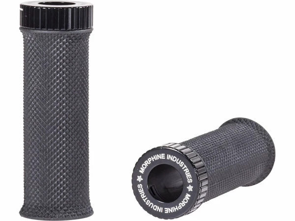 The Morphine Industries Grom Mini Lock-on BMX grips feature a thin knurled rubber gripping surface and a machined aluminum lock that also doubles as a bar end. The grip requires only one lock which reduces weight compared to other lock-on grips that use 2 locks.