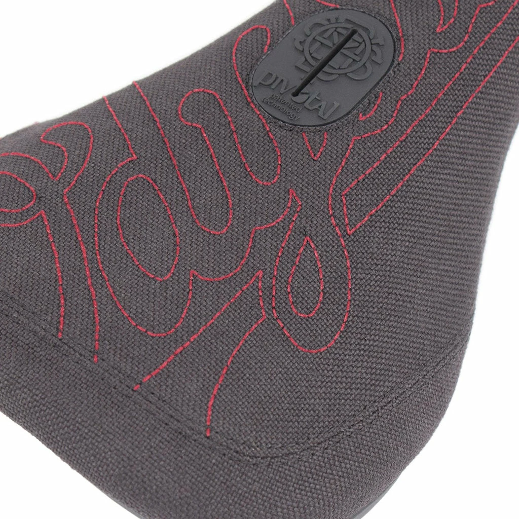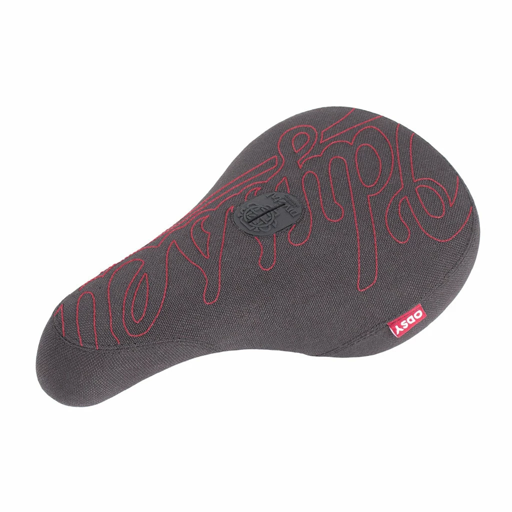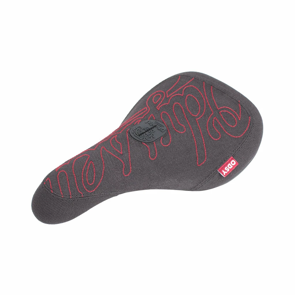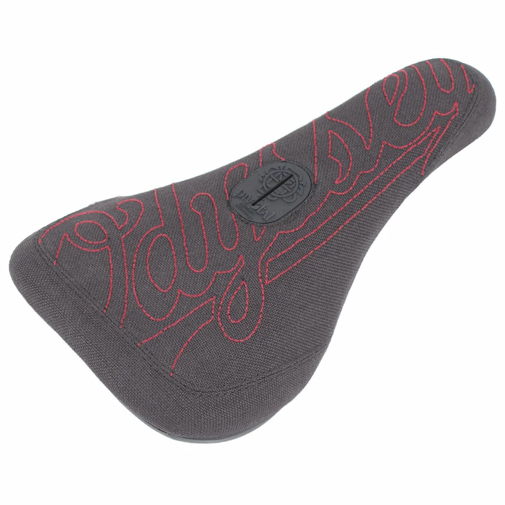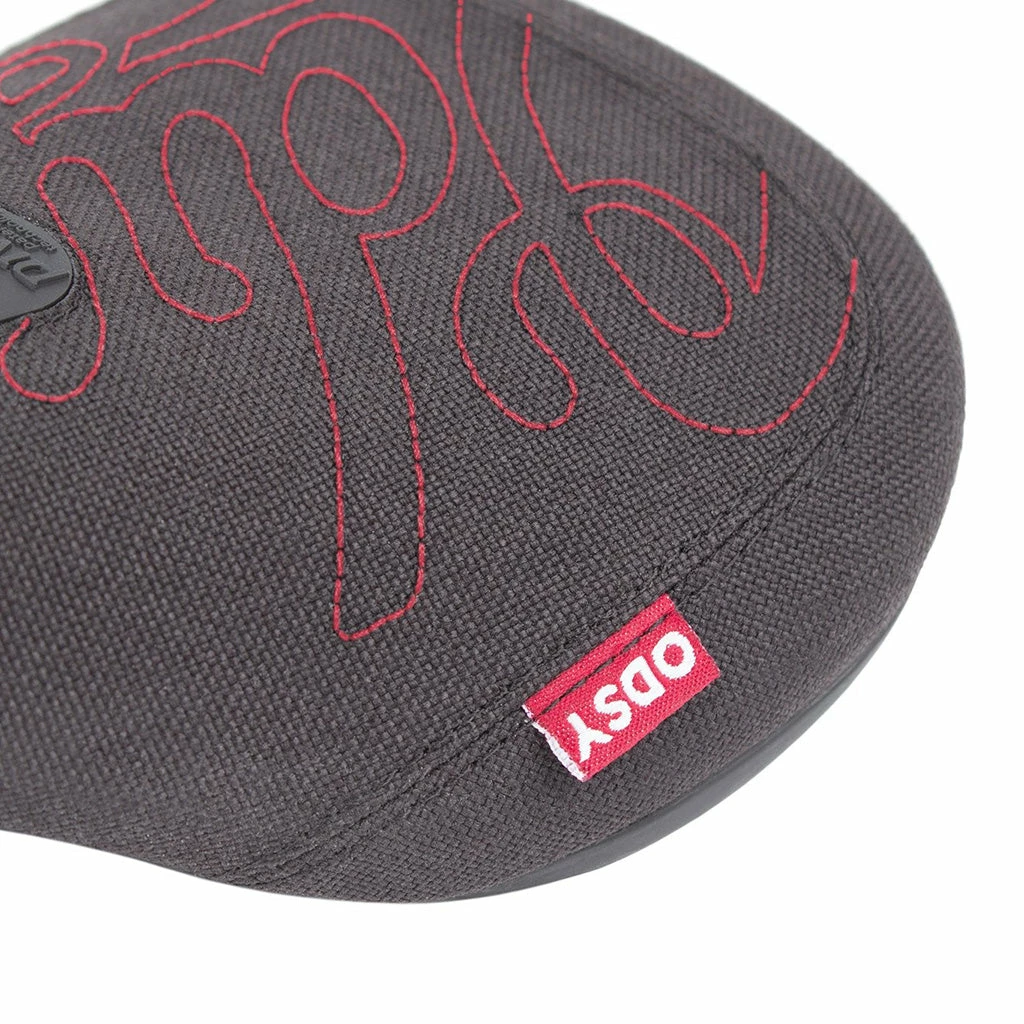 The Odyssey Big-Stitch Pivotal Seat at J&R Bicycles is constructed with a heavy-duty black canvas cover with a baseball-inspired big Slugger logo stitched on. The subtle contrast between the red stitching and black cover adds a touch of class to this design. Available in slim or fat options depending on your preference.