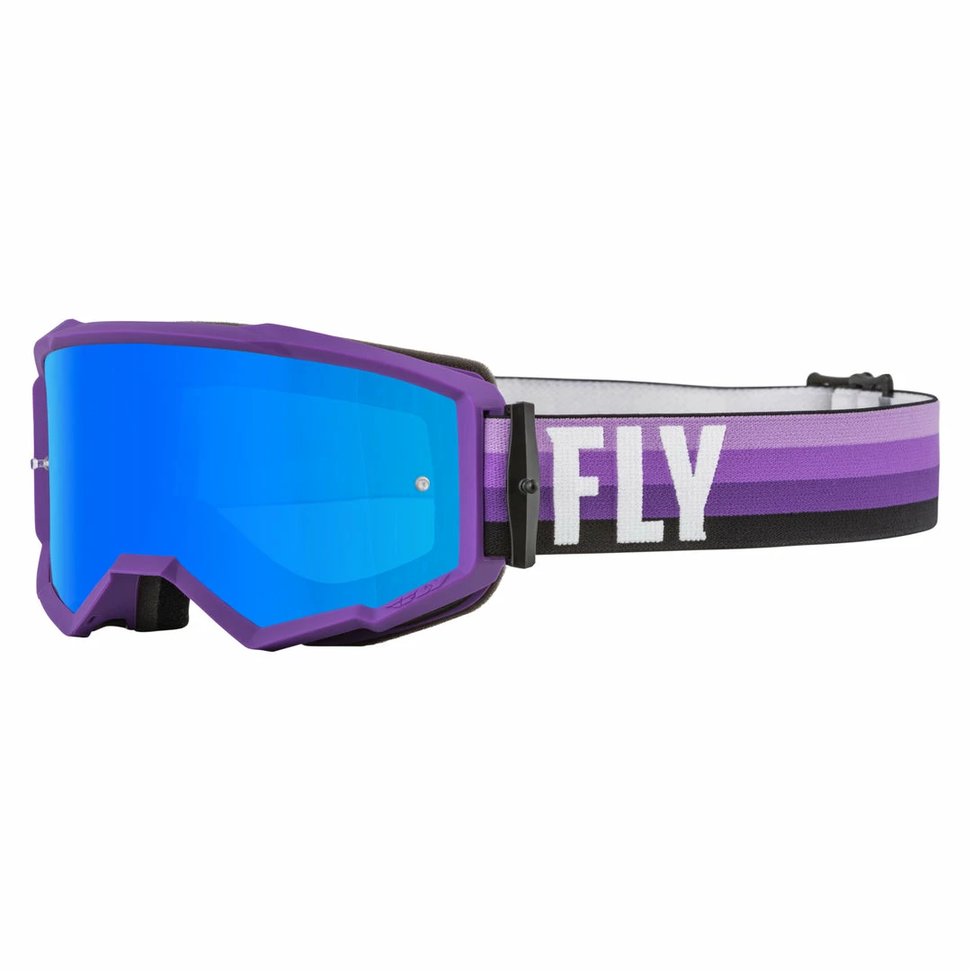 Fly Racing Zone Goggles-Purple/Black with Sky Blue Mirror/Smoke Lens are are designed to provide lots of peripheral vision and still fit properly while wearing a helmet. There are built in tear-off posts and the strap has a non-slip inner surface to ensure it doesn’t slide around on the back of your helmet while the anti-fog coating keeps you focused on the finish line even under the most tropical of conditions. Included is a sweet microfiber bag.
