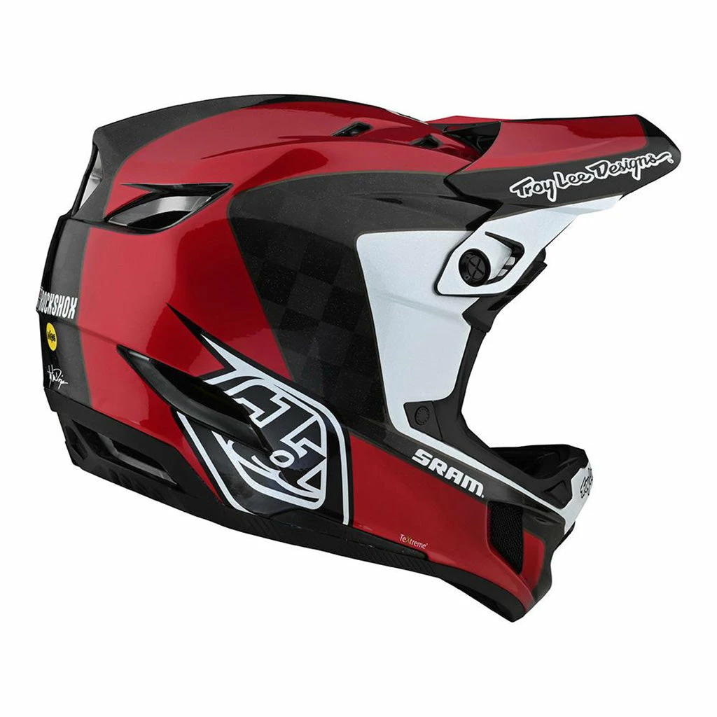 The Troy Lee Designs D4 Carbon MIPS Corsa Sram Helmet-Red weighs in at just 1 kilogram making it one of the lightest helmets in the game. Incorporates the MIPS brain protection system to help prevent rotational stress resulting from angled impacts. Instead of steel, the D-rings are titanium to get just that little extra bit of weight saving. The EPP collarbone impact system is a specially designed area to help mitigate helmet-collarbone/shoulder impacts. Anti-microbial/Quick Dry XT2 Quick release cheek pads to avoid that stinky, cold, wet feeling you get when putting on your helmet again for the next heat.