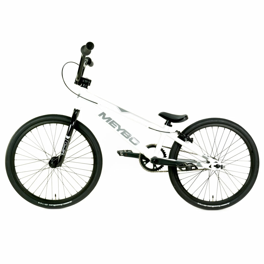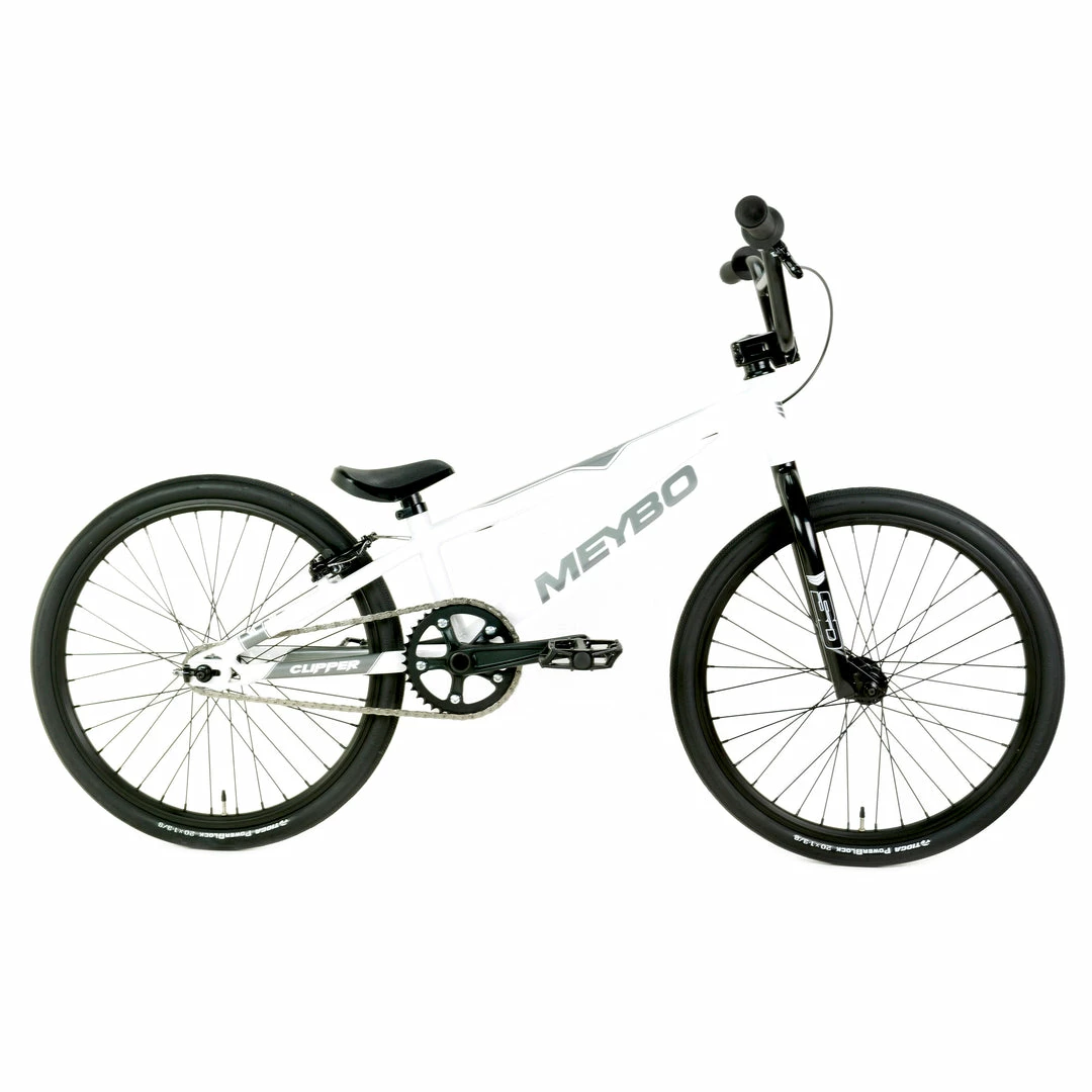 The Meybo Clipper Expert BMX Race Bike-White/Grey/Black is the budget minded sibling to Meybo’s race winning Holeshot model. Keeping it in the family, the two model’s frames share the exact same geometry. You guys look SO alike! Clearly what sets the Clipper apart is the accessible price point for what is, let’s be honest, an incredible bike. Features a bunch of SD Components. The fork, stem, handlebars, seat, crankset…all from SD. Race ready Tioga Powerblock tires provide a solid bike-track interface.