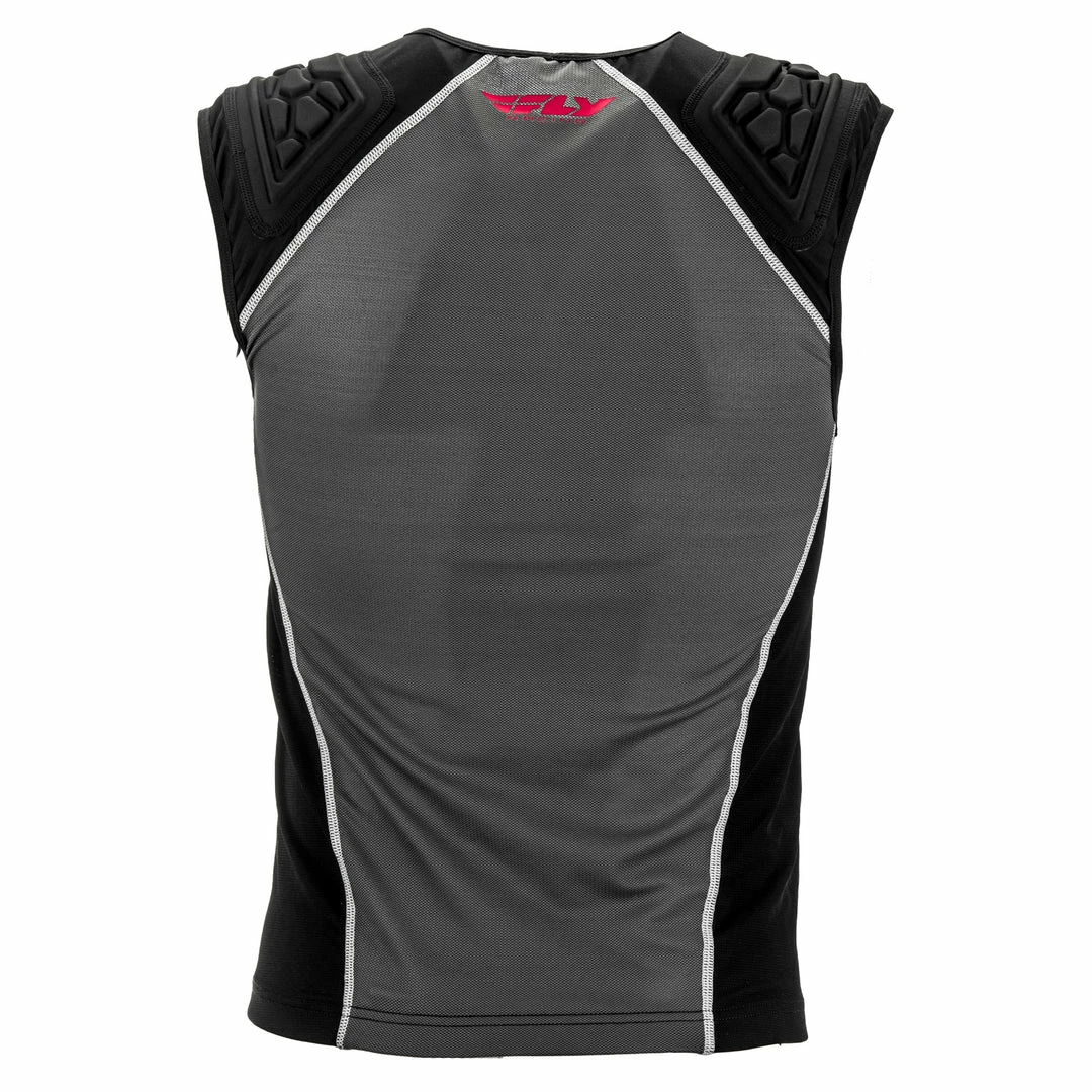 The Fly Racing Barricade Pullover Protective Vest-Black is made of thermoformed EVA foam padding. Designed to fit best in a riding position, the vest is breathable, with lots of perforations, and very lightweight with a stretchy, meshy material throughout.