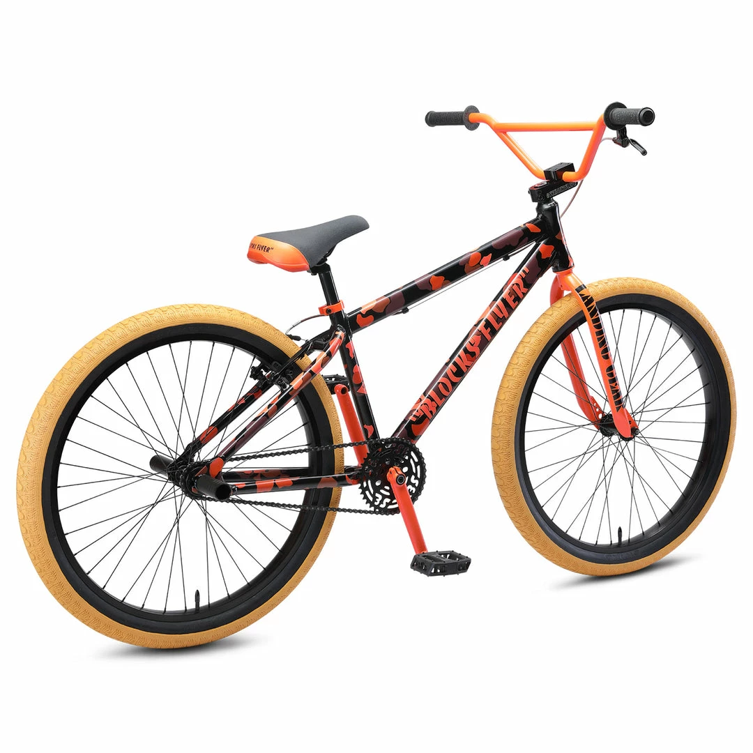 The SE Blocks Flyer 26″ BMX Freestyle Bike-Orange Camo is the bike on demand if you want to raise it up with your SE crew. This year’s frame has been improved with an internal headset and mid bottom bracket. The new 26″ x 2.4″ Bozack tires ride great and provide super traction for those swerves. Wait a minute it is time to be a wheelie maniac and keep it swerving. D Block has made it possible once again. Ride safe.