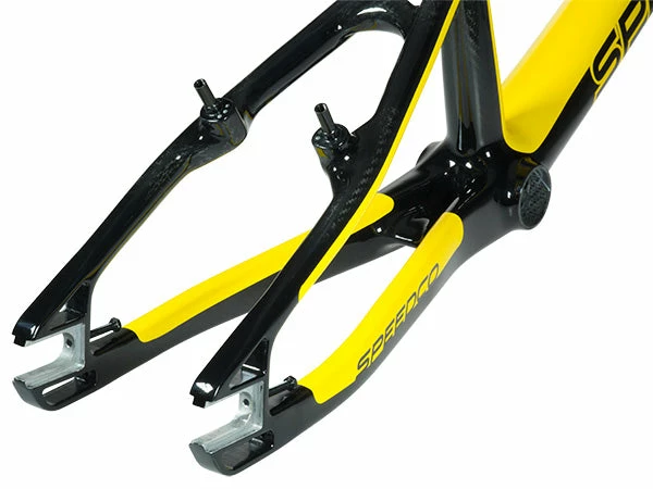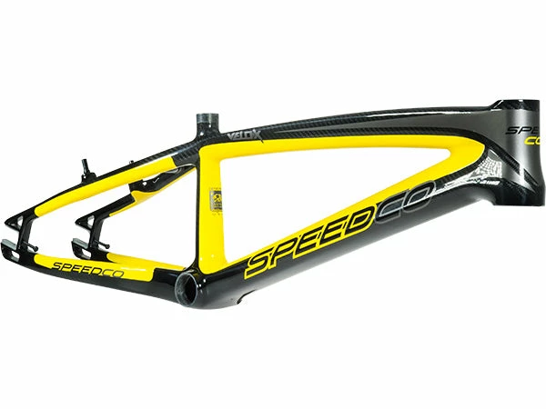 The Speedco Velox Carbon BMX Race Frame is the lightest frame on the market. It’s made of Toray T700 carbon fiber, which is the strongest carbon available. The rigidity and responsiveness of the Velox carbon is unmatched. On Pro and larger sizes, the down-tube is 53mm wide at the head tube junction, and it tapers to 73mm at the bottom bracket which is wider than the shell of most frames on the market. The asymmetrical chain-stay is 73mm behind the BB, and the combination of the two are the main ingredients in a responsive frame built to holeshot; the rest is up to you.