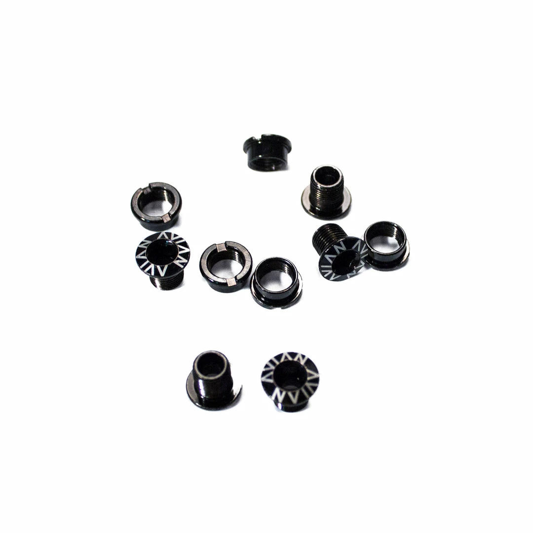 The AVIAN Alloy Chainring bolts are light weight and available in short and long, with laser etched logos. Package includes a set of 5 bolts/nuts.