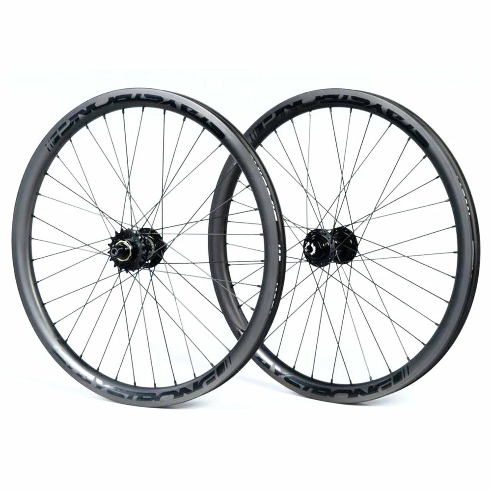 The Stay Strong Carbon Disc BMX Race Wheelset-24×1.75″ has sealed alloy hubs. The rear wheel is a 16T cassette with 6 pawls and 180 points of engagement. Both rims are made of the highest quality carbon with a classy, glossy water decal. The rear rim’s braking surface has been precision CNC’d. It might go without saying if you look at the photos, but this wheelset does not include a brake disk.