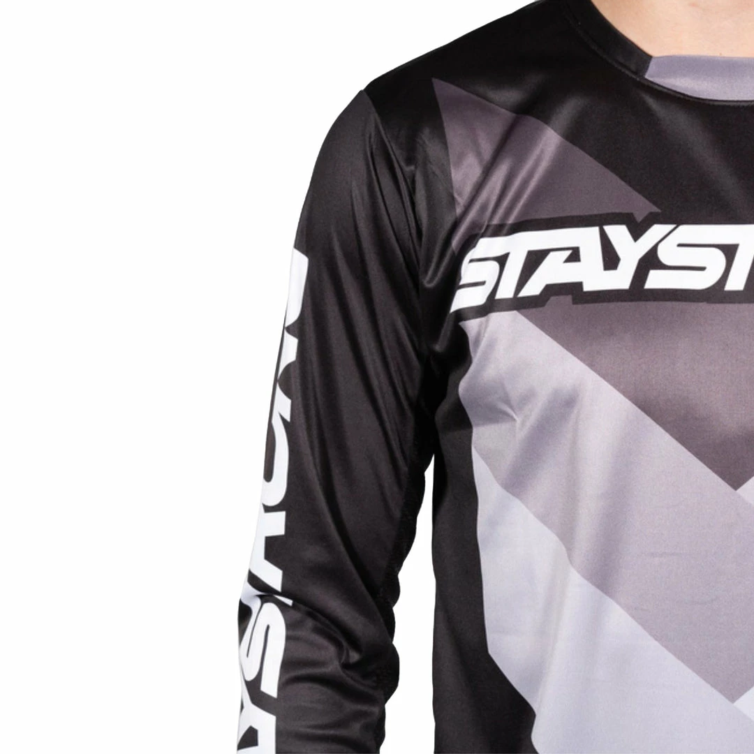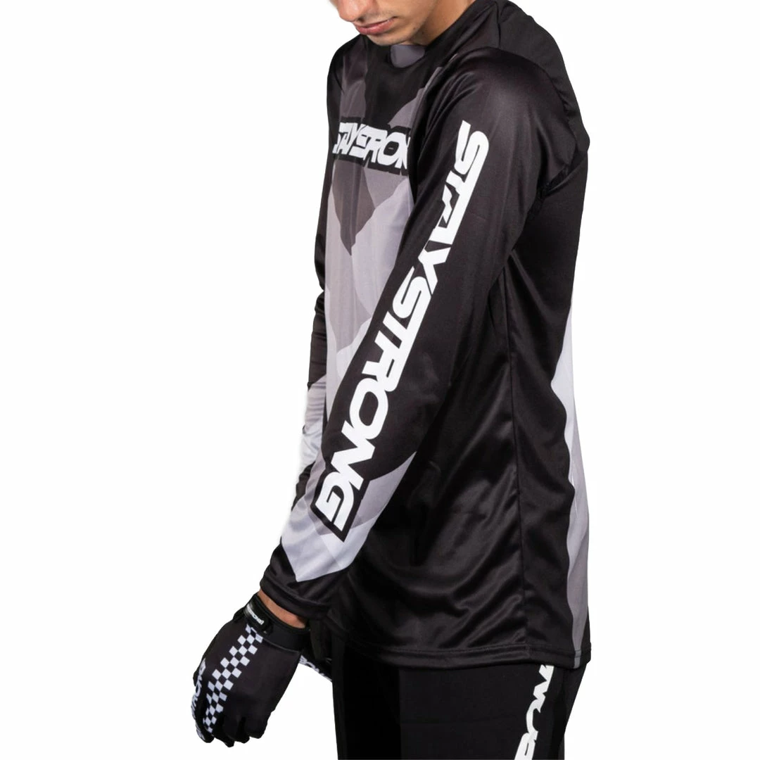 The Stay Strong Chevron Jersey-Black is a slim fit design with super comfy collar paneling and a new chevron graphic on the chest….and another low-slung on the back. Aw yeah. Don’t forget the mesh inner arm panels that go all the way up.