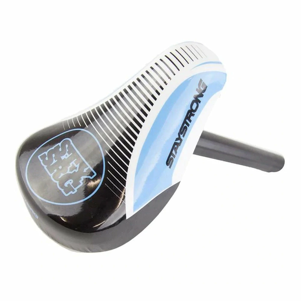 The Stay Strong Race DVSN Mini BMX Seat/Post Combo is a super lightweight and convenient setup for smaller sized bikes that have a 22.2mm diameter seat tube. Designed as a mid seat with a durable vinyl cover that will resist wear and tear and the vinyl top is covered in eye-catching Stay Strong logo design. This one-piece seat and post combo makes installation quick and easy.
