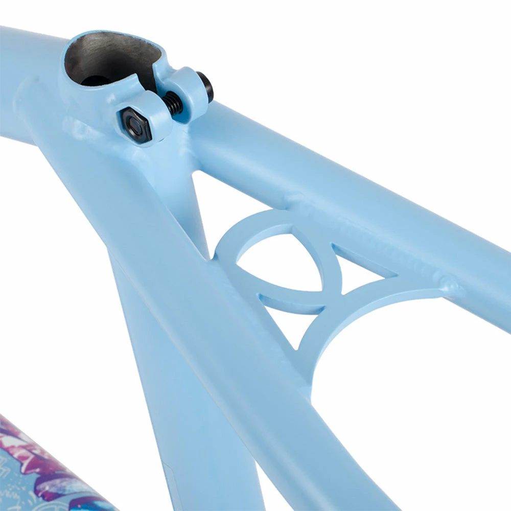 The Subrosa Griffin BMX Frame-Periwinkle Blue is a technical 4130 chromoly frame. The double butted top and bottom tubes are, we can assure you, quite strong. This freestyle focused frame features a hydro-formed down tube, CNC shaped BB shell, and a laser cut seat stay bridge. Weighing in at only 4.9 lbs, you’ll be sure to get all that air you’ve been after…and with the graffiti inspired graphics you’ll look rad doing it.