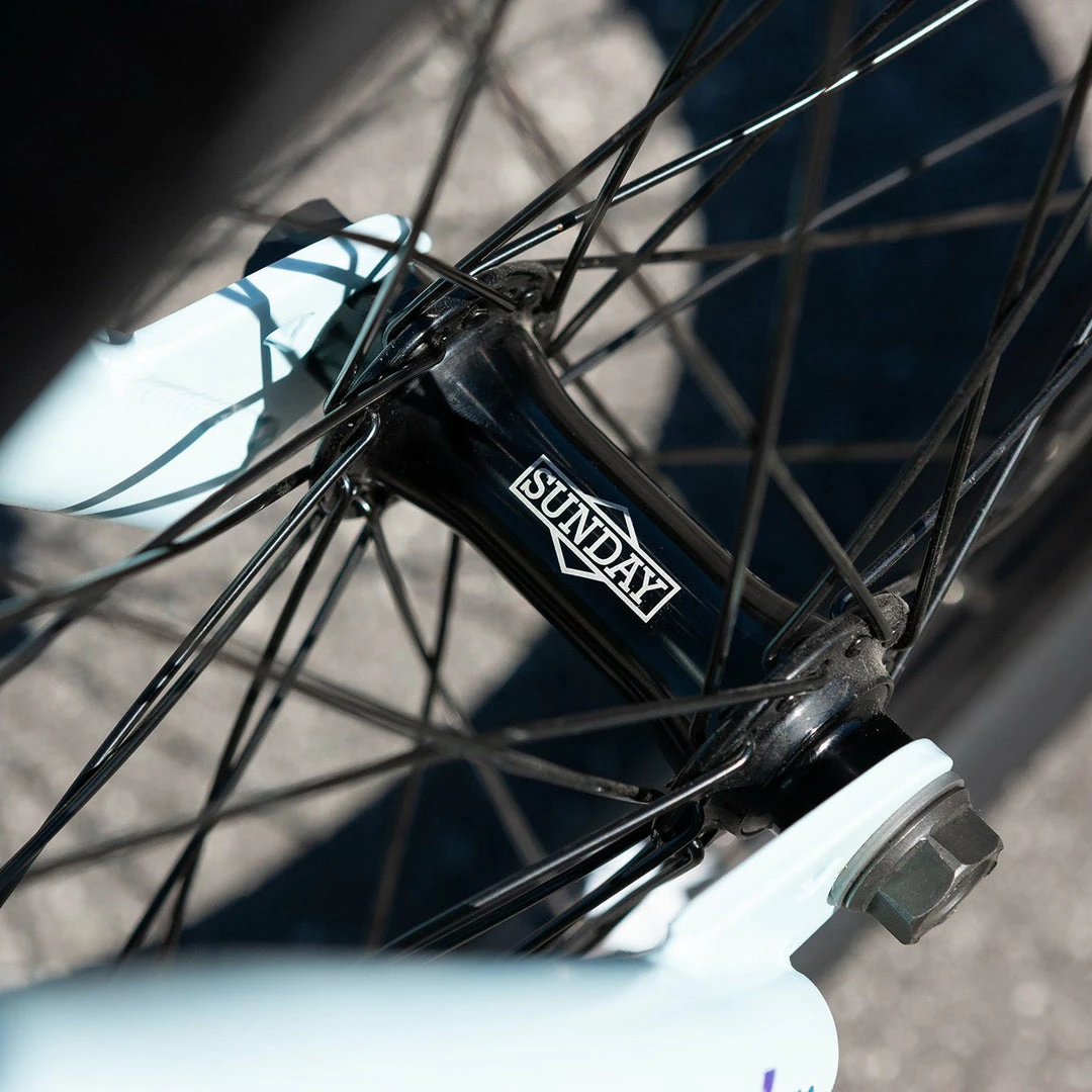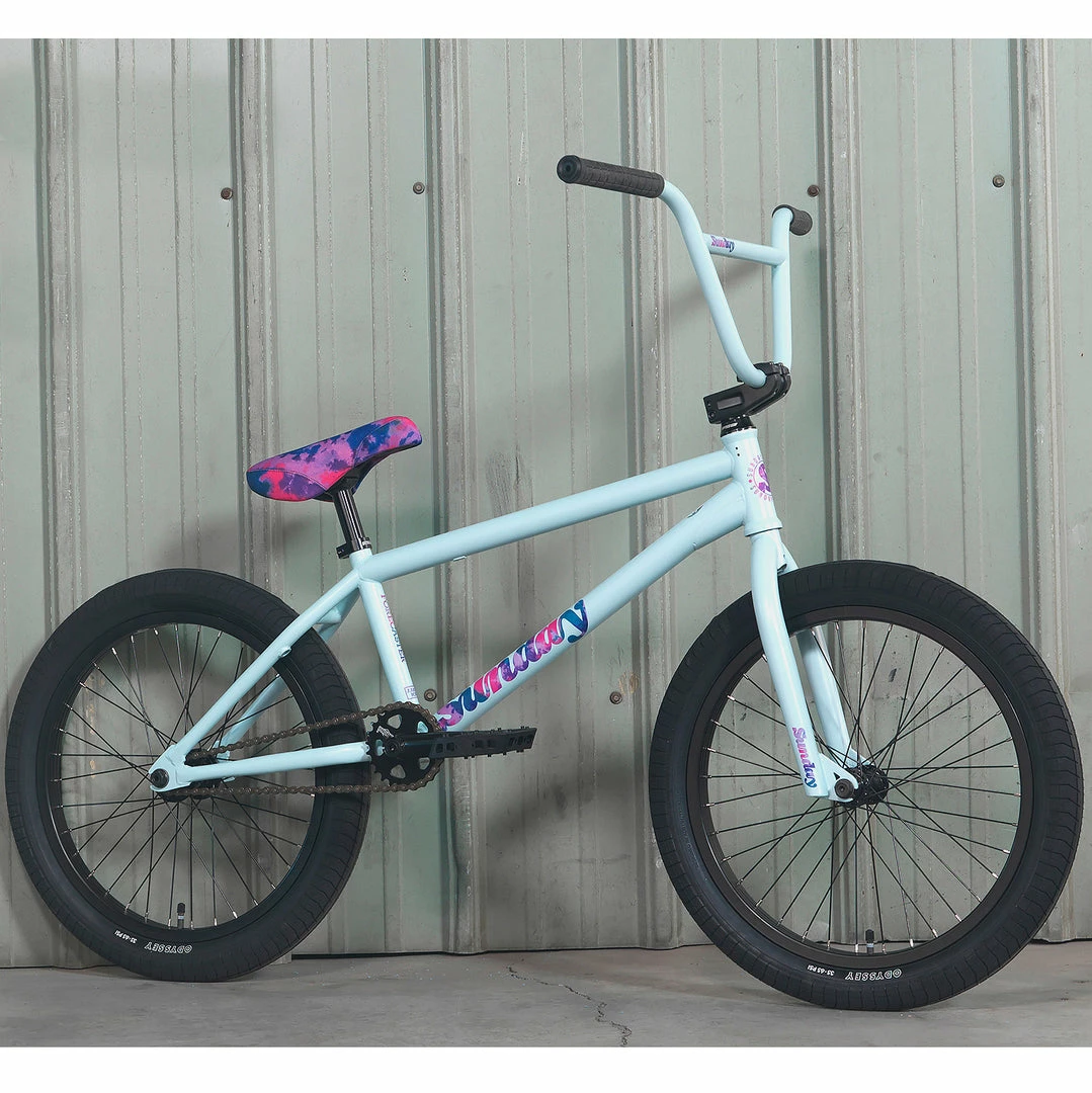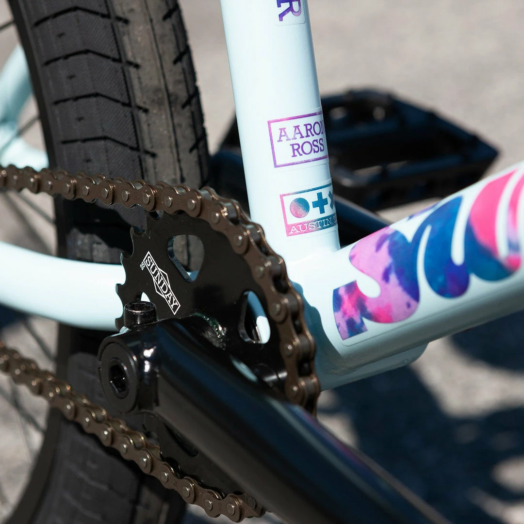 Truly a sight to behold, the Sunday Forecaster 20.5″TT BMX Freestyle Bike-Matte Sky Blue is the Aaron Ross signature model for 2022. Just as eye catching as last year’s matte pink bike with mexican blanket seat, this year’s model is matte sky blue with a tie-dye pink-purple-blue seat with matching Sunday logo on the frame. Featuring the Odyssey Clutch V2 Freecoaster Hub which allows for external slack adjustment using a 2.5 hex key through an access hole on the hub…no need to remove the wheel! Other Odyssey parts include Path Pro 2.4″ tires, the Aaron Ross signature tie-dye seat, and Twisted Pro pedals.