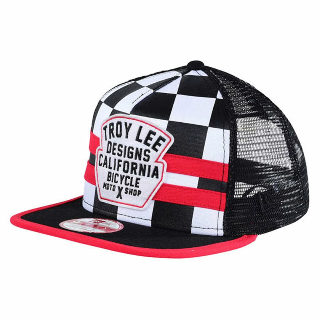 The Troy Lee Designs Granger Hat features New Era 9FIFTY Original Fit, 5-Panel Cotton Twill, mesh-back foam trucker. Embroidered logo patch at front, screen-printed checks, appliqué stripes, plastic adjustable snapback and TLD flag label at back.