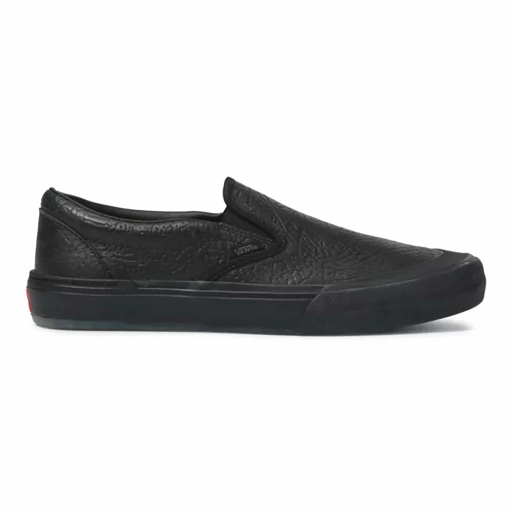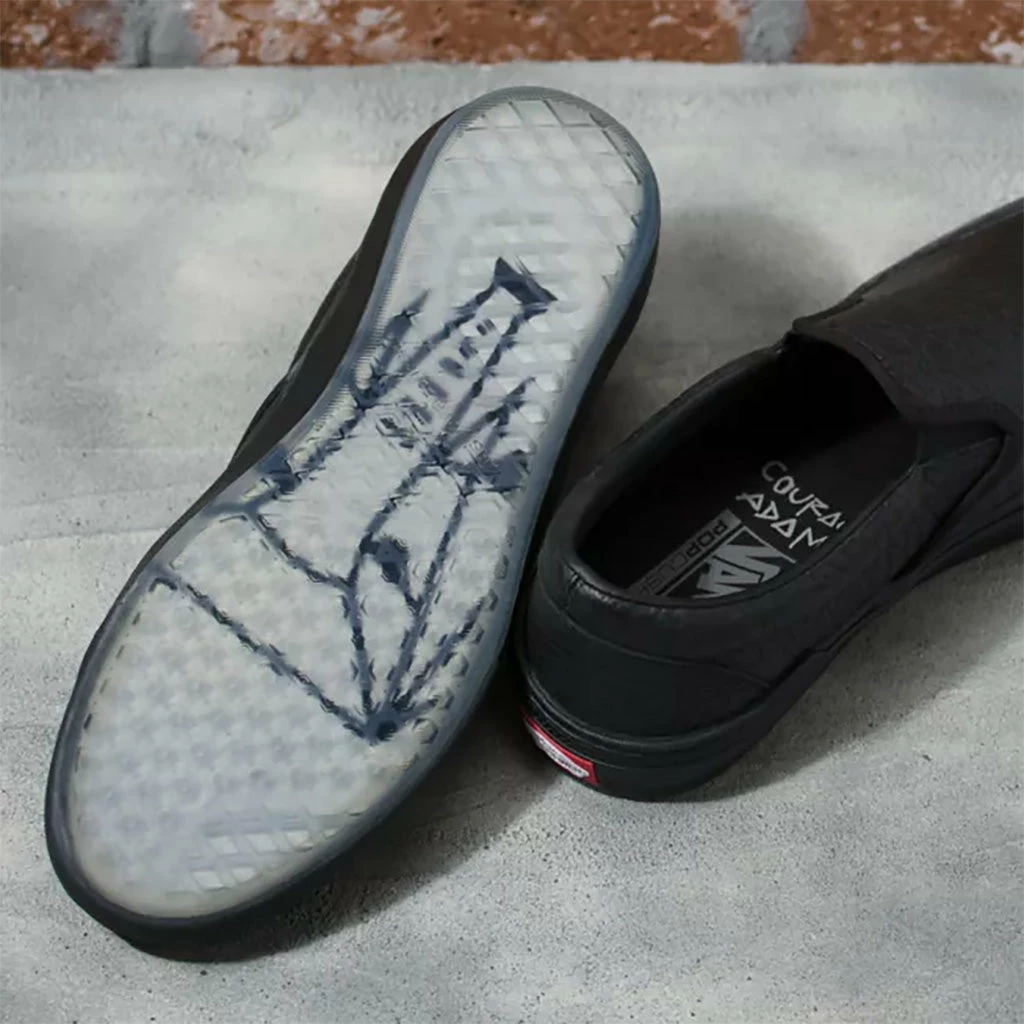 Vans Courage Adams Slip-On BMX Shoes-Black Elephant are Courage Adams signature slip on. They feature Courage’s own artwork on the bottom which can be seen through the translucent rubber compound with Van’s Wafflecup tread. The leather upper is black with “elephant skin” texture making for an all-around unique shoe.