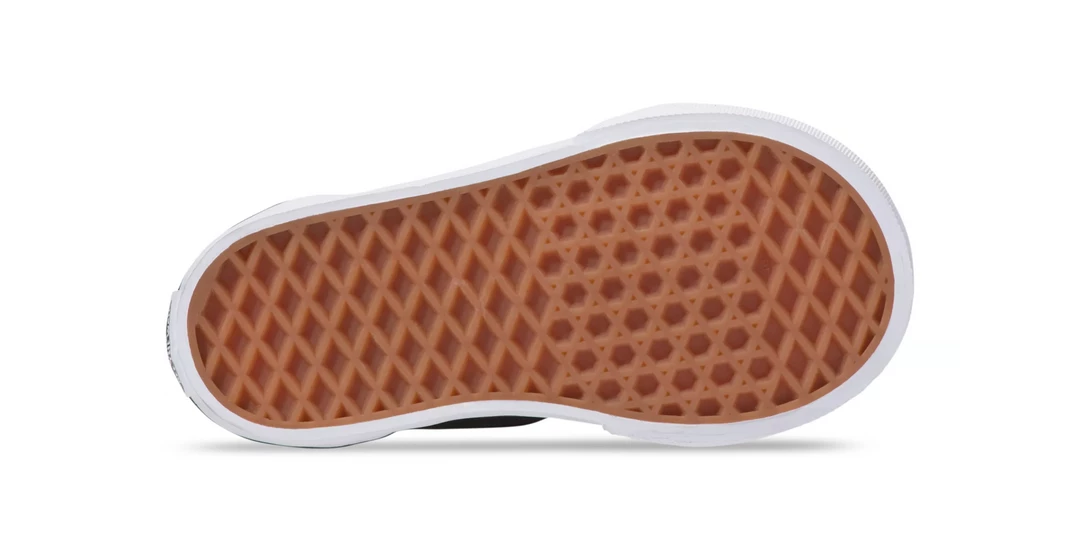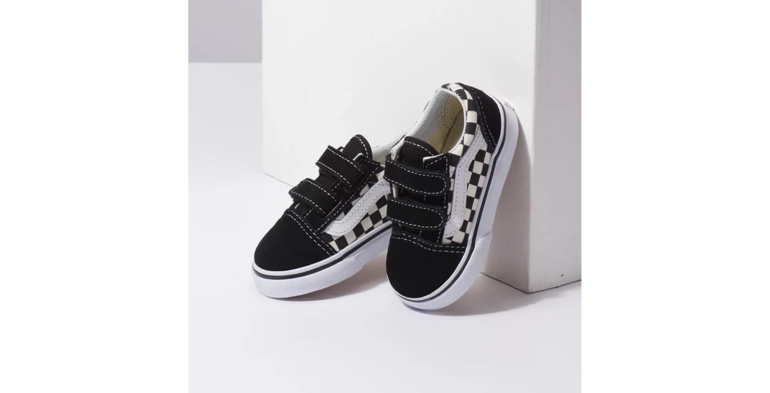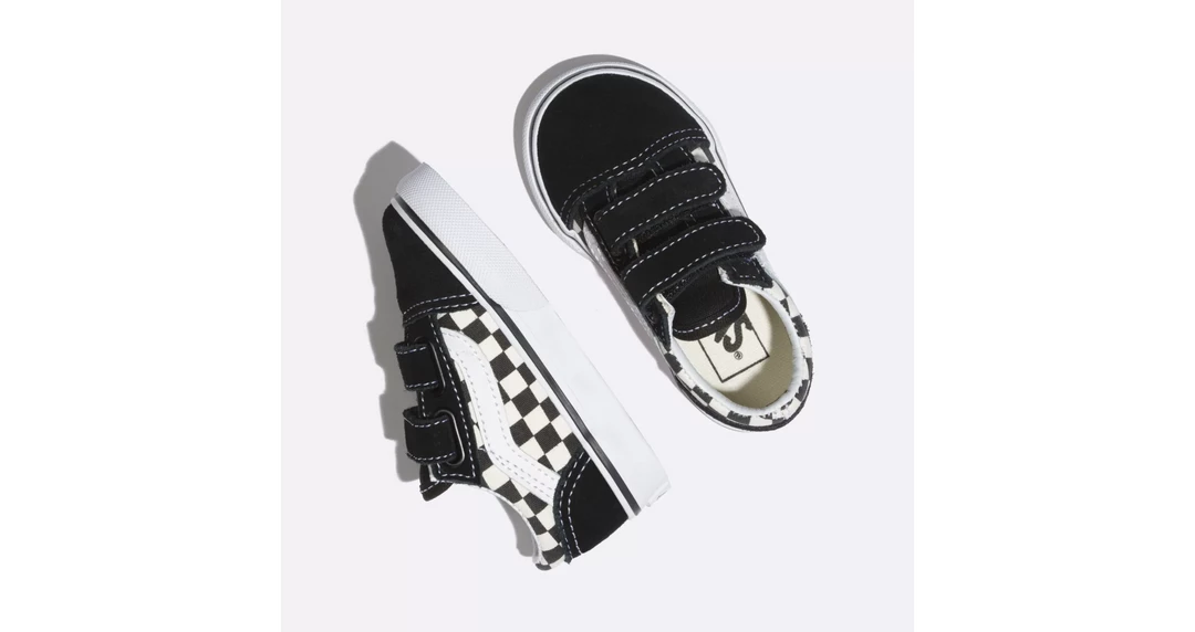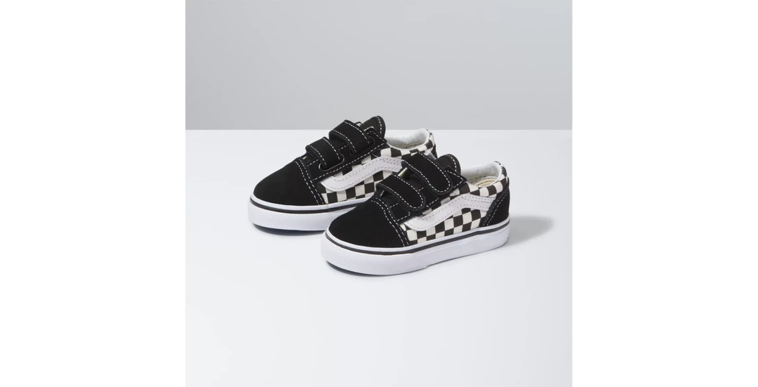 The Vans Old Skool V Primary Toddler Shoe-Black/White Checkerboard, inspired by the Vans classic skate shoe, features a low profile silhouette with sturdy checkerboard-printed canvas and suede uppers, hook-and-loop closures, padded collars for support and flexibility, and signature rubber waffle outsoles.