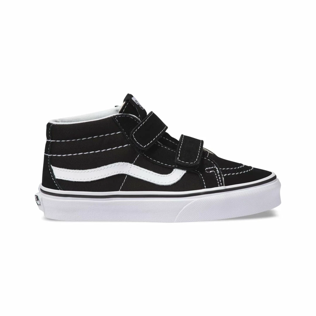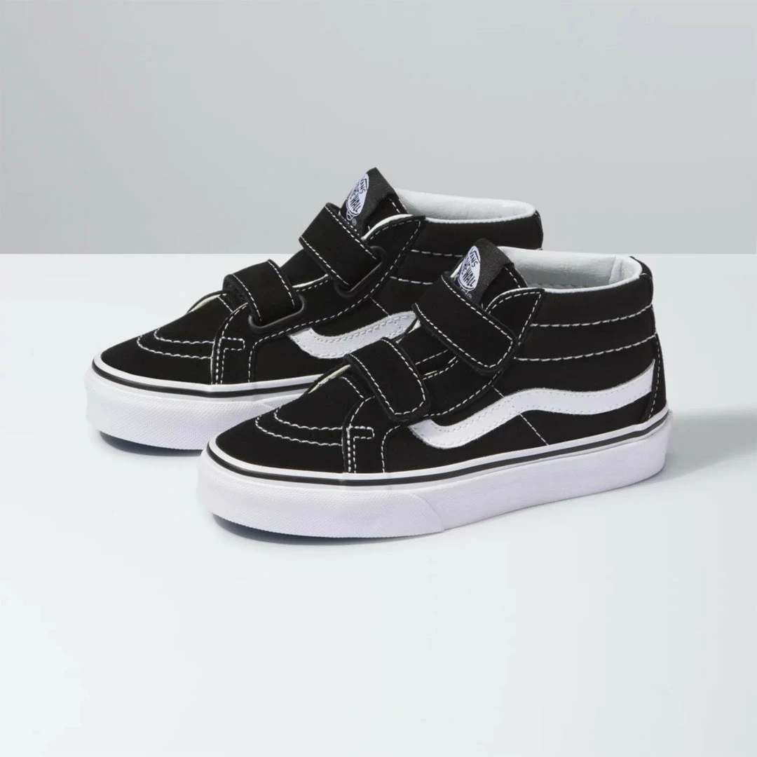 Keep your young one looking fresh and stylish, just like you did at their age. The Vans SK8-Mid Reissue V Canvas & Suede Kids Shoes-Black/White features the iconic Vans sidestripe and signature Waffle Outsoles. The canvas and suede uppers come with two hook-and-loop closures for kid-friendly entry, along with soft padded collar and heel counters for better support.