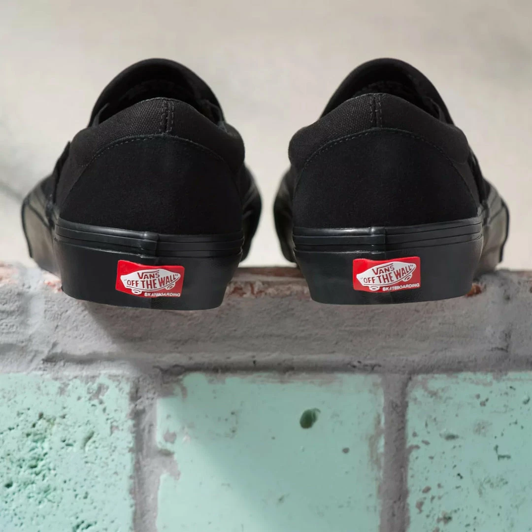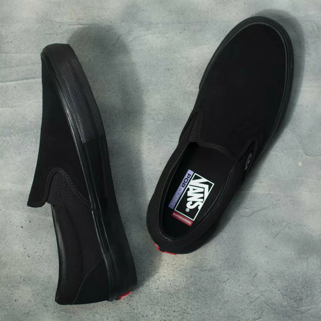Part of the all-new Skate Classics collection, the Vans Skate Slip-On Shoes-Black/Black features DURACAP reinforced materials in the higher sidewalls and toe bumpers to provide more durability and protection. The uppers have been totally redesigned with internal tongue straps for a locked-in feel, improving board control. The PopCuch and internal heel stiffeners help lessen leg fatigue as well as provide you better support and stability to keep you skating longer sessions.