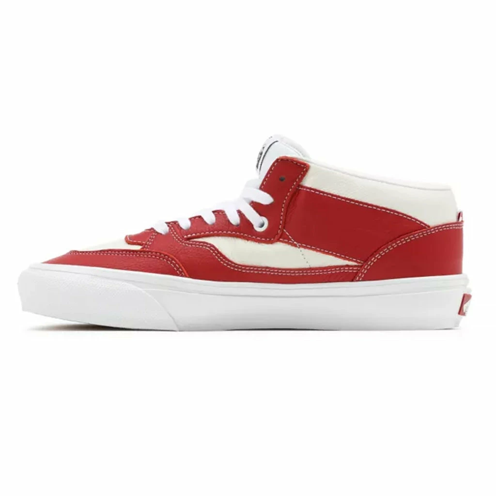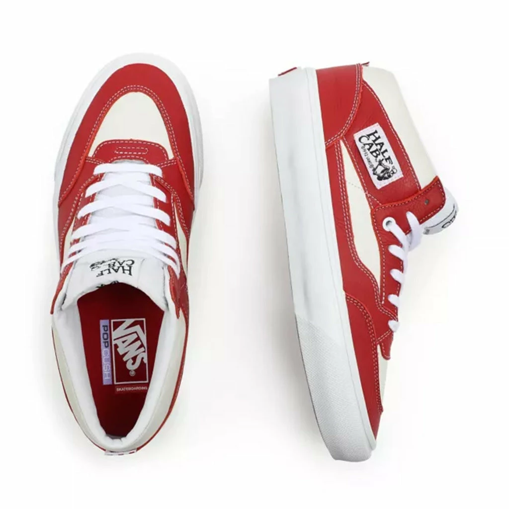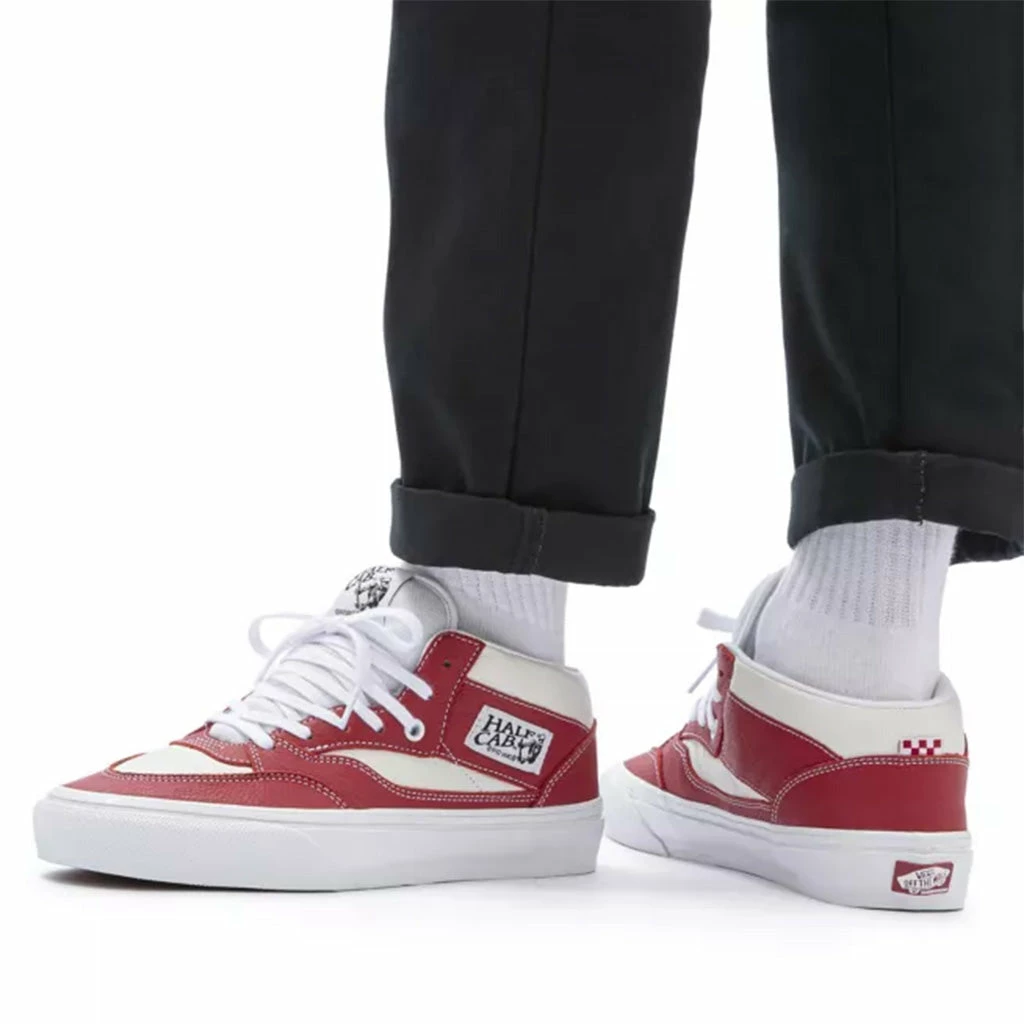 These Vans Skate Sport Leather Skate Half Cab ’92 BMX Shoes-Chili Pepper/White are a new and improved version of the classic skate shoe style that we all have grown to know and love. The reinforced Duracap underlays have been repositioned and a two-part foxing tape has been added which allows a deeper knurl pattern in the tow. These modifications, along with new Sickstick rubber soles, mean these suede and canvas mid-tops retain their classic style while offering more durability, comfort, support and maximum grip.